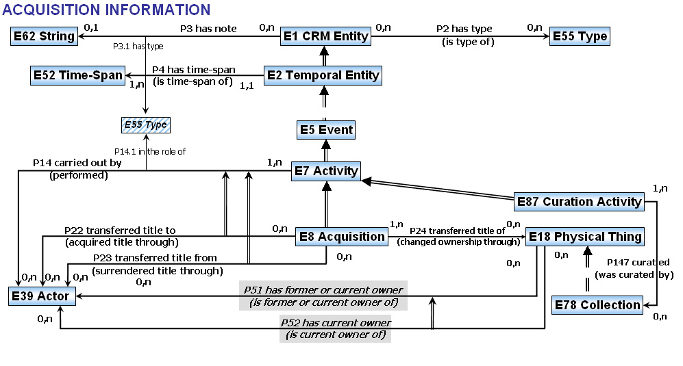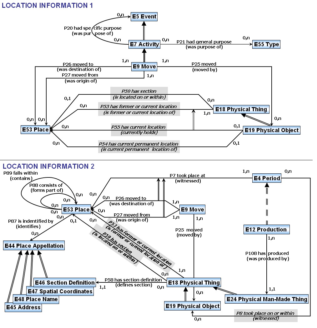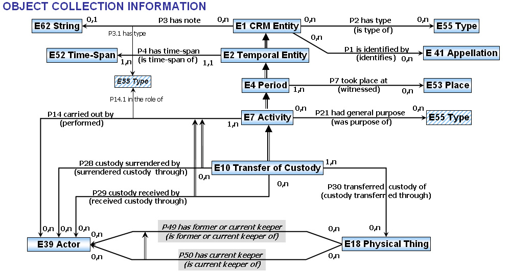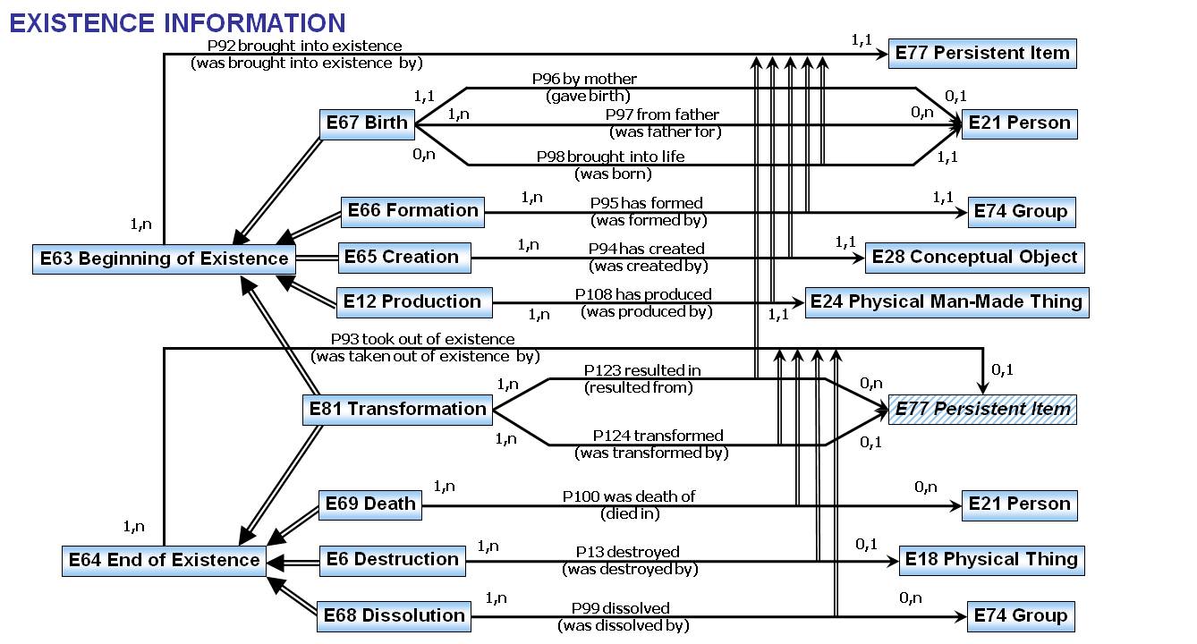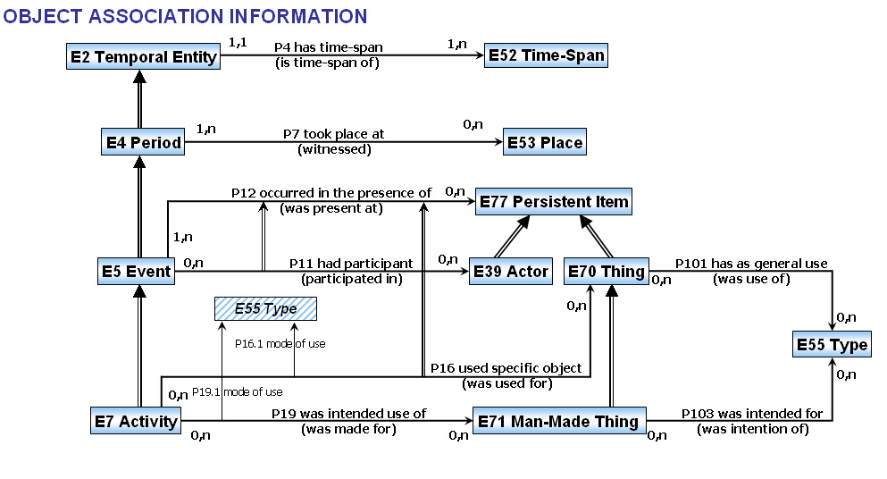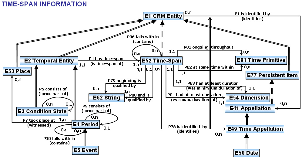 | Time-Span Information | E1 CRM Entity, E2 Temporal Entity, E3 Condition State, E4 Period, E5 Event, E41 Appellation, E49 Time Appellation, E50 Date, E52 Time-Span, E53 Place, E59 Primitive Value, E61 Time Primitive, E62 String, E77 Persistent Item | P1 is identified by, P4 has time-span, P5 consists of, P7 took place at, P9 consists of, P10 falls within, P78 is identified by, P79 beginning is qualified by, P80 end is qualified by, P81 ongoing throughout, P82 at some time within, P83 had at least duration, P84 had at most duration, P86 falls within | Version 7.1.3 |