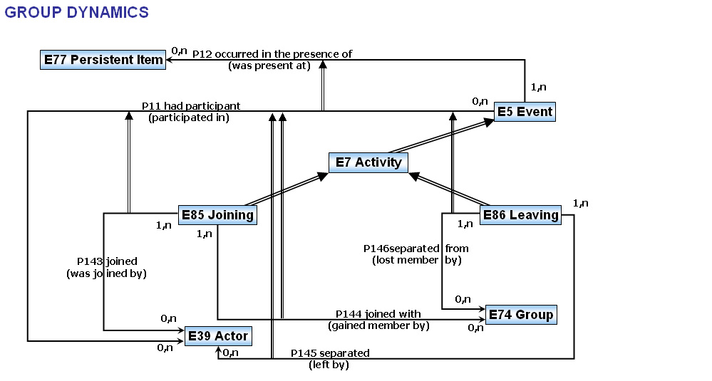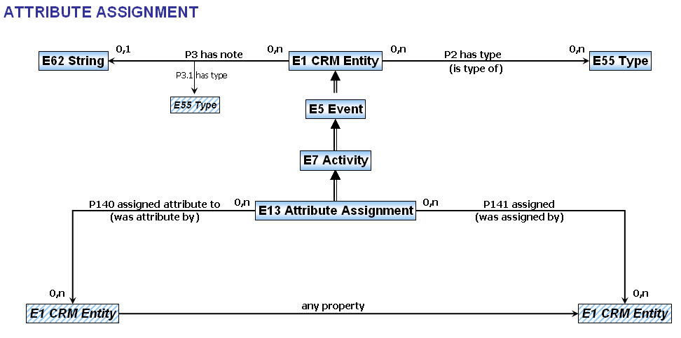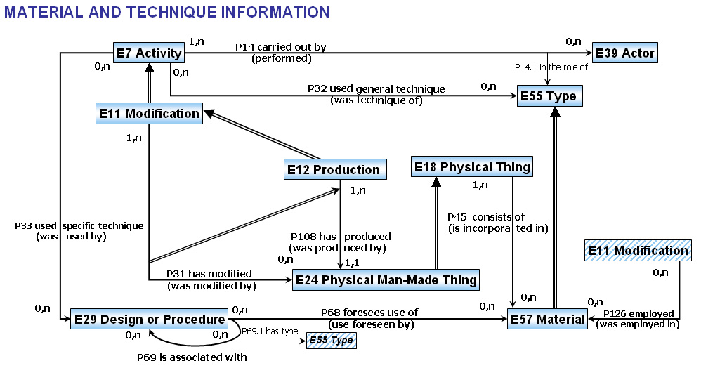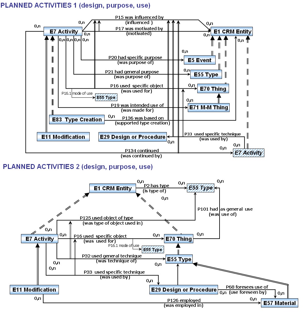 | Planned Activities (design, purpose, use) | E1 CRM Entity, E5 Event, E7 Activity, E11 Modification, E29 Design or Procedure, E55 Type, E57 Material, E70 Thing, E71 Man-Made Thing, E83 Type Creation | P2 has type, P15 was influenced by, P16 used specific object, P17 was motivated by, P19 was intended use of, P20 had specific purpose, P21 had general purpose, P32 used general technique, P33 used specific technique, P68 foresees use of, P101 had as general use, P125 used object of type, P126 employed, P134 continued, P139 has alternative form | Version 7.1.3 |