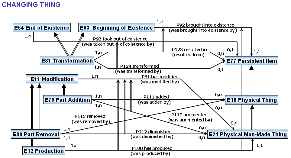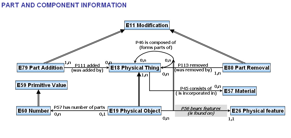 | Part and Component Information | E11 Modification, E18 Physical Thing, E19 Physical Object, E26 Physical Feature, E57 Material, E59 Primitive Value, E60 Number, E79 Part Addition, E80 Part Removal | P45 consists of, P46 is composed of, P56 bears feature, P57 has number of parts, P111 added, P113 removed | Version 7.1.3 |