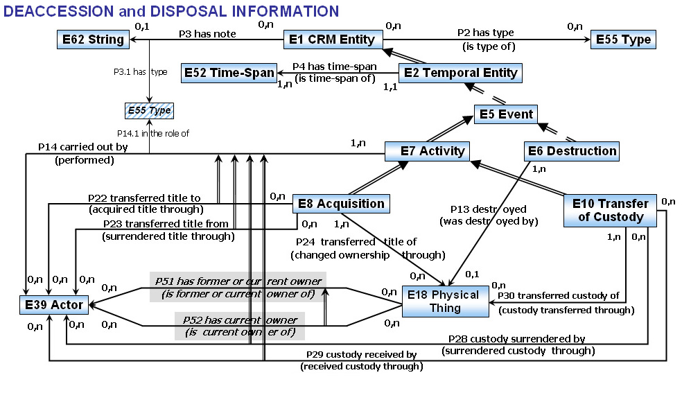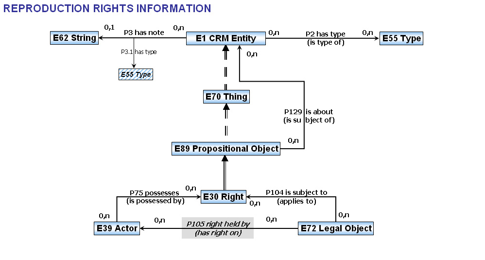 | Reproduction Rights Information | E1 CRM Entity, E30 Right, E39 Actor, E55 Type, E62 String, E70 Thing, E72 Legal Object, E89 Propositional Object | P2 has type, P3 has note, P75 possesses, P104 is subject to, P105 right held by, P129 is about | Version 7.1.3 |