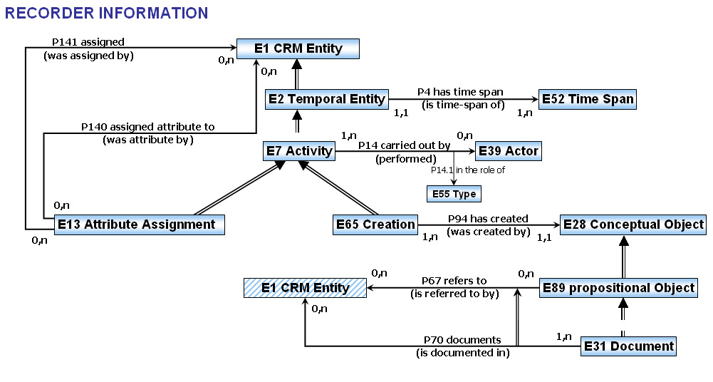 | Recorder Information | E1 CRM Entity, E2 Temporal Entity, E7 Activity, E13 Attribute Assignment, E28 Conceptual Object, E31 Document, E39 Actor, E52 Time-Span, E65 Creation, E89 Propositional Object | P4 has time-span, P14 carried out by, P67 refers to, P70 documents, P94 has created, P140 assigned attribute to, P141 assigned | Version 7.1.3 |